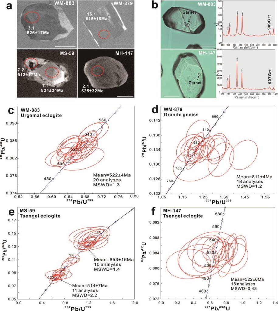 (2)Urgamal榴辉岩原岩年龄不老于811 Ma(花岗片麻岩围岩年龄),榴辉岩相变质年龄为~522 Ma;Tsengel榴辉岩原岩年龄~853 Ma,榴辉岩相变质年龄为~522 Ma(图2);