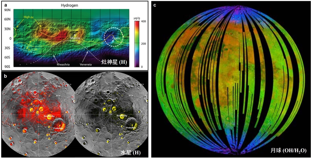 图1 灶神星、水星和月球表面水的分布特征。(a)“黎明号”获得的灶神星全球性氢含量分布特征(Prettyman et al. (2012);(b)“信使号”探测任务获得的水星极区及高纬度地区的氢含量分布特征(Lawrence et al., 2013);(c)“月船一号”探测任务获得月球表面的羟基(OH)或水分子(H2O)分布特征(Pieters et al., 2009)