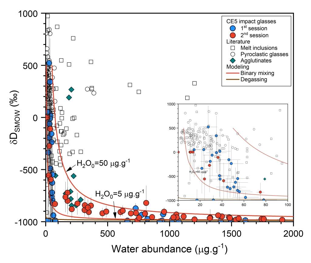 图4 嫦娥五号月壤中撞击玻璃珠水含量与氢同位素的负相关性。撞击玻璃珠的水含量和氢同位素可以用二元混合模型进行约束(红色实线),两个端元分别为太阳风成因水(δD = -990‰, H2O=2000 ppm)和玻璃珠内生水(δD = 500‰, H2O0=5-50 ppm)。同时模拟了H2去气(棕色实线),去气模型并不能实现玻璃珠中观察到的氢同位素组成