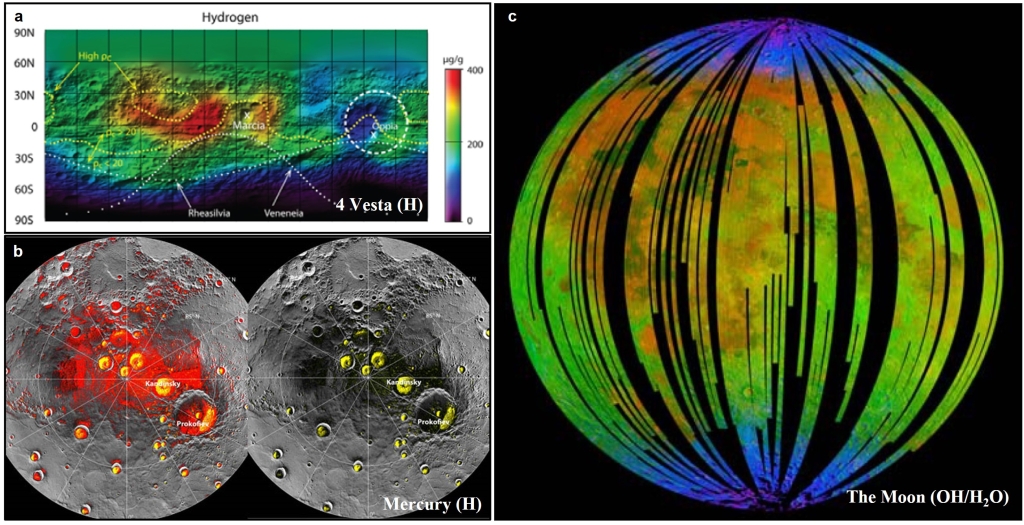 随着探测能力的提升,太阳系中越来越多的无大气天体都发现表面可能存在水(广义水,包括H、OH和H2O),例如灶神星、水星、月球(图1)。这些天体表面探测到的水含量虽远不如地球,但仍然吸粉无数,因为有水的地方就有无限可能。