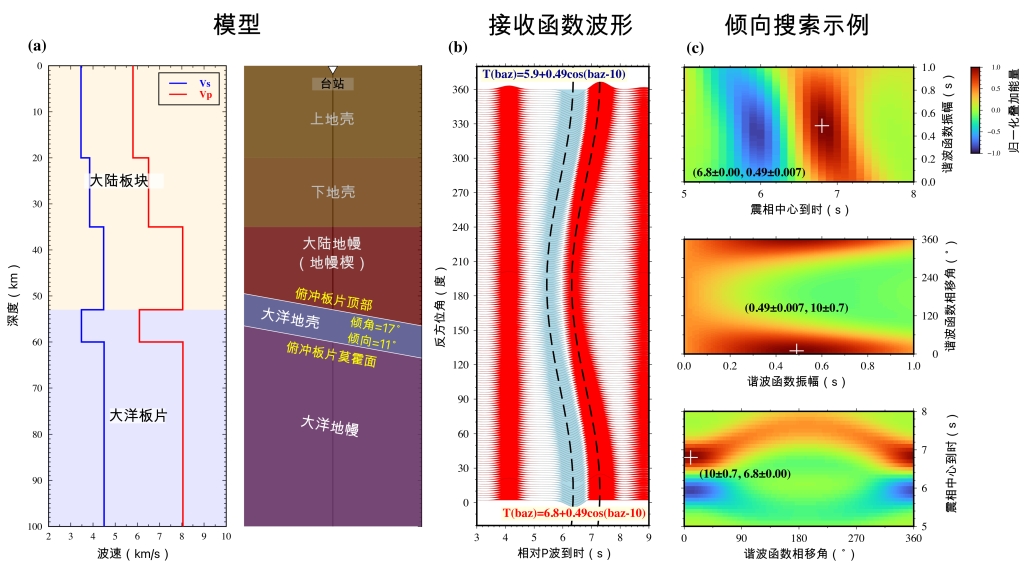 800彩票岩石圈演化国家重点实验室岩石圈演化动力学学科组博士生冯铭业与导师陈凌研究员、新加坡南洋理工大学韦生吉副教授等利用远震P波接收函数波形随反方位角的谐波变化特征,提出了定量估计俯冲板片界面倾向的新方法,并将该方法命名为倾向搜索法(图1)。地震波正演测试表明,倾向搜索法能够较为准确地约束俯冲板片界面的倾向,并且在噪声水平相对较高、存在一定地壳和地幔各向异性、远震数据反方位角覆盖不完整或不均匀,以及上述因素同时存在的情况下均表现出较高的稳健性。除了估计界面倾向,倾向搜索法还能够同时应用于俯冲板片的分层性分析,估计波速间断面深度和速度异常层厚度,因此对俯冲板片结构也具有较好的约束。倾向搜索基于单个地震台站,获取台站下方结构,无需密集台阵,因此适用于地震台站稀疏的情况。