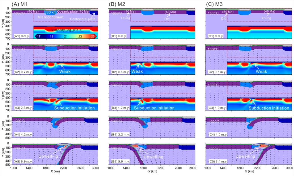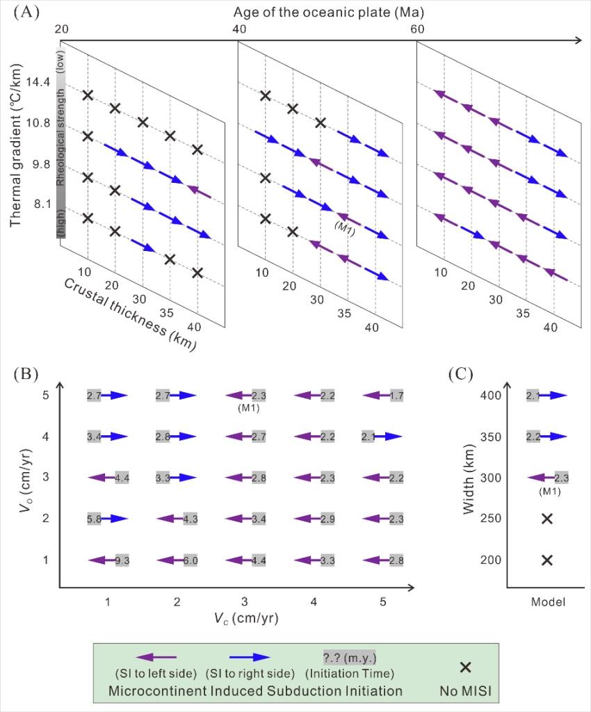 800彩票朱明帅副研究员、颜智勇博士后、陈林研究员、苗来成研究员、张福勤研究员,联合上海交通大学的李顺副研究员和西班牙格拉纳达大学的Daniel Pastor-Galán等开展数值模拟工作,研究微陆块诱导初始俯冲的动力学过程。根据微陆块形成机制,设计了三种基础模型。模拟结果表明(图2),相对于被动大陆边缘,微陆块的边缘更容易产生初始俯冲,而且相对于老的大洋板块,年轻的大洋板块更易发生初始俯冲。初始俯冲过程中有明显的软流圈上涌(未来的SSZ型蛇绿岩),而微陆块会被肢解破坏,且大部分被俯冲的大洋板片带到地球深部。另外,该研究工作还系统测试了微陆块热梯度、流变学性质、地壳厚度、微陆块两侧大洋板片的年龄、板块汇聚速率和微陆块大小等因素对微陆块诱导初始俯冲的影响(图3)。