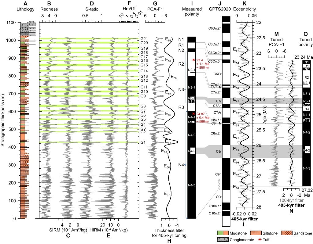 达则错剖面厚约1018米,主体为河湖交互相沉积。底部地层主体岩性为紫红色泥岩与粉砂-细砂岩互层,剖面底部起400米以上的岩性为灰绿色泥岩-粉砂质泥岩层(共21层)与紫红色泥岩-粉砂-细砂岩互层(图2,图3)。为了厘定它们的形成时间及其周期性,他们采集了565块古地磁定向样品用于磁性地层学研究。结合剖面所夹的火山灰层提供的同位素年代学约束,最终的磁性地层结果显示达则错剖面的年代为27.4-22.9 Ma。他们在该剖面采得了2129块古气候散样(平均间隔1.9 kyr),通过多种代用指标建立了剖面的古气候序列。利用Acycle软件进行天文轨道调谐,最终赋予古气候序列的调谐年代为27.32-23.24 Ma(图3)。