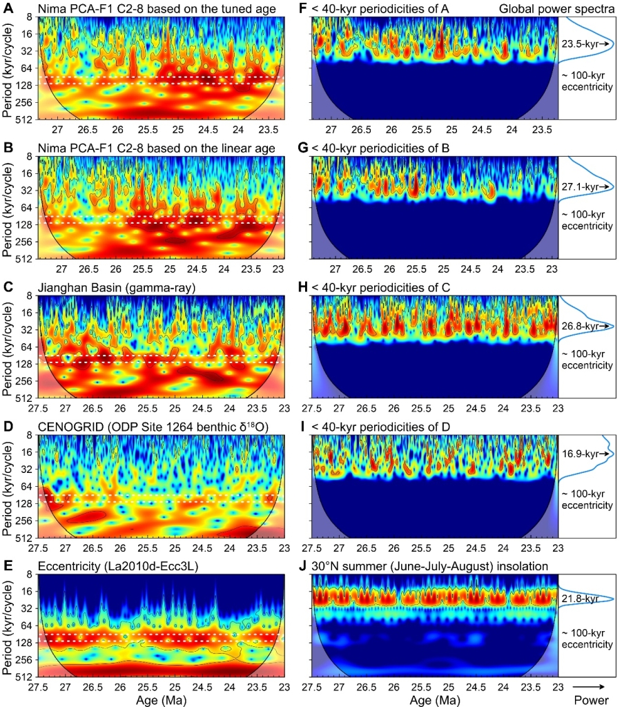 图4 达则错剖面古气候及其它地质记录、理论曲线的小波分析。(A, B, F, G 为尼玛盆地PCA-F1经希尔伯特-黄变换HHT提取的成分C2~8,A和F基于405-kyr谐调年代,B和G基于磁性地层线性内插年代;C、H为江汉盆地伽马序列,代表东亚季风;D, I为深海氧同位素;E为理论偏心率;J为北纬30度夏季太阳辐射;F-I为去掉40-kyr以上周期的小波图,以突显岁差信号)