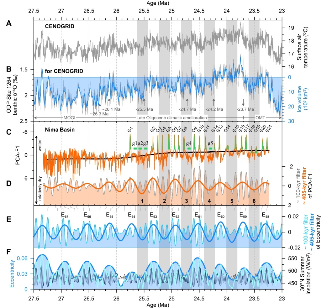他们认为剖面的磁性矿物变化受湖水深浅控制,湖水深浅受降水影响(排除构造作用之后),因此磁学序列揭示的干湿旋回反映了区域古降水变化,且响应地球轨道周期。前人研究表明晚渐新世高原中部的水汽来源主要是印度洋而非西风水汽,因此,他们认为这些降水是由南亚季风携带而来,绿层的出现可视为南亚季风强化的标志。地球轨道偏心率及岁差通过驱动南亚季风导致了尼玛盆地的周期性古降水变化,这一现象起始于至少27.3 Ma,表明季风降水此时已经到达了尼玛盆地(32oN)。达则错剖面第一绿层的发育时间为25.8 Ma,指示南亚季风于此时开始强化。