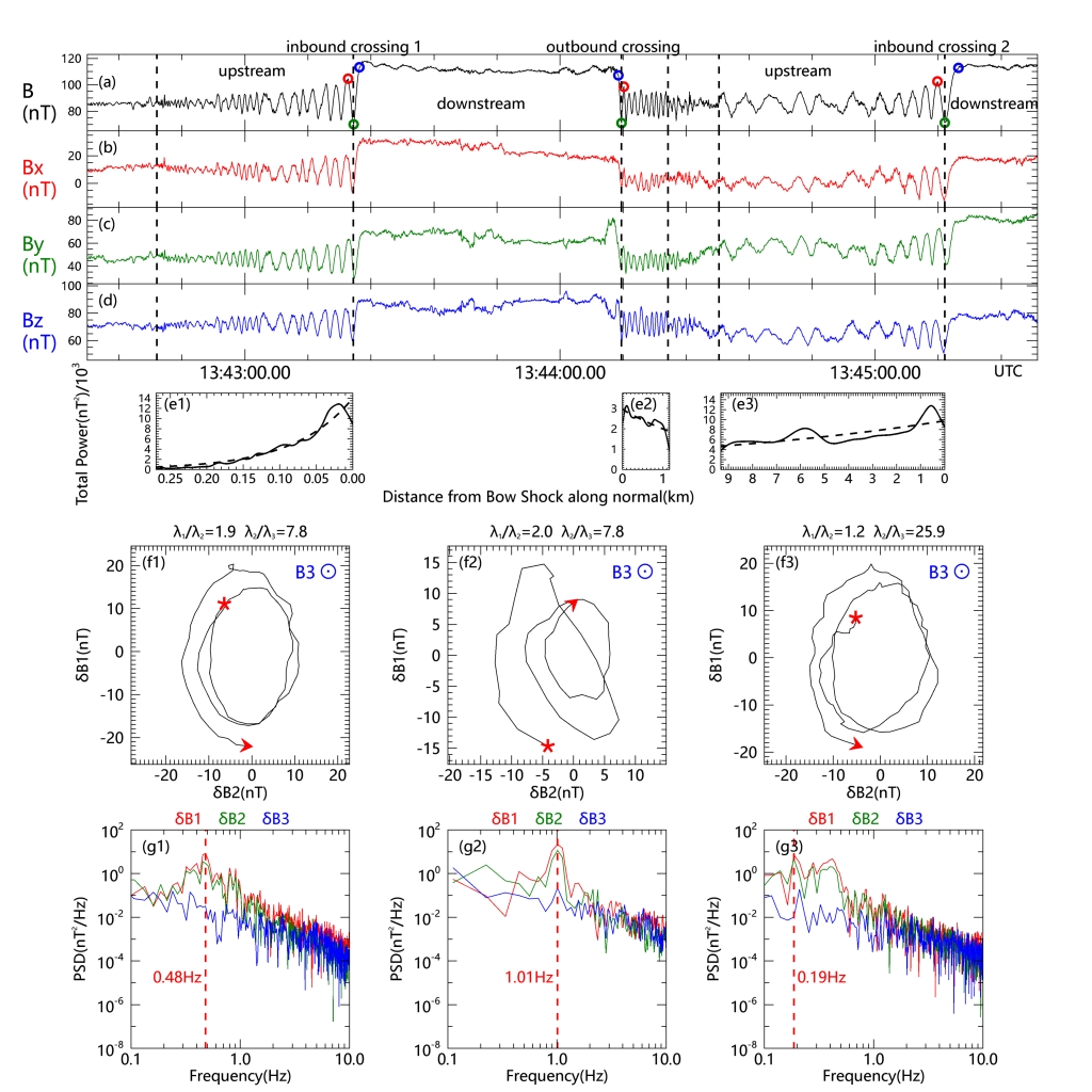 驻哨声波相对于激波在空间上具有恒定相位,沿激波法线方向传播,并能在几个波周期内迅速衰减(图1)。当卫星从上游移动到下游时,驻哨声波相对于磁场方向表现为右手极化(绿色方框中为波的极化方向)。相反,当卫星朝相反方向运动时,表现为左手极化。驻哨声波在地球弓激波的上游很少被观测到,因为它们通常发生在低MA条件下。