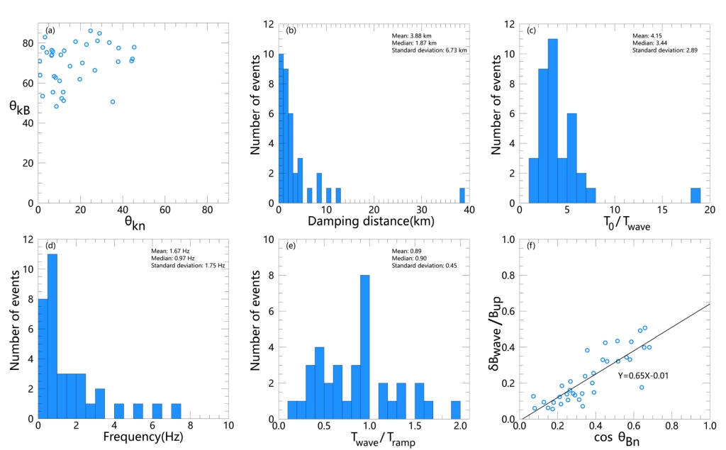 图3 水星弓激波上游驻哨声波统计特征。(a)波矢与磁场(kB)及激波法向(kn)的夹角;(b)卫星坐标系中波的衰减距离;(c)波幅衰减时间与波周期之比;(d)波频分布;(e)波周期与激波坡道之比;(f)波幅与激波角余弦的相关性