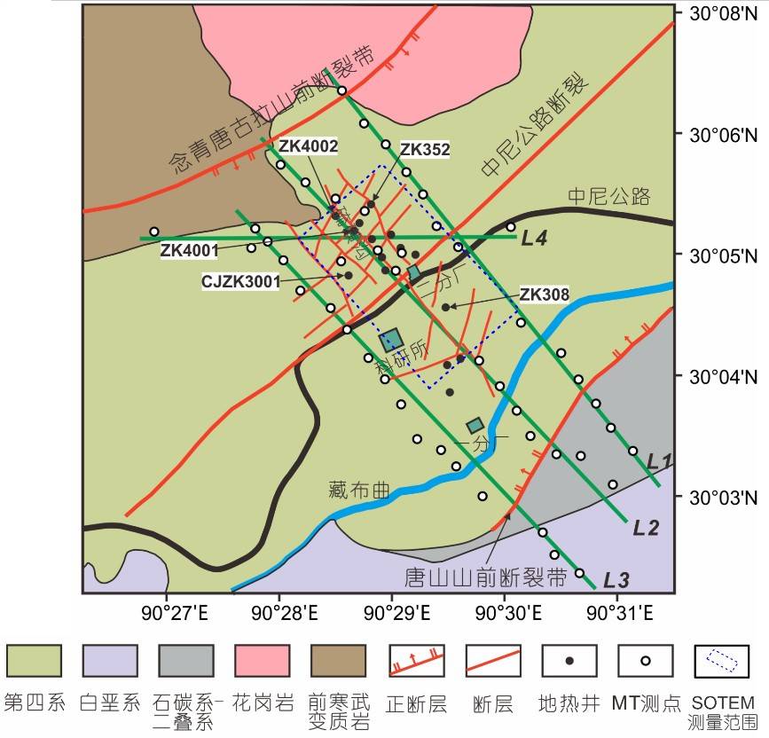 西藏羊八井地热田是世界上著名的高温地热田,历经四十多年的开发利用,浅部地热资源日趋萎缩,亟需开发深部高温地热资源来维持地热发电或新增装机容量。深刻了解深部热源位置和形态、断裂分布特征、地热流体的升流通道以及深层热储结构,对于开发深部高温地热资源具有十分重要的意义。以往地球物理工作探测深度一般不超过1km,且多以二维处理解释为主,未能给出地热田精细的深部电性结构。地热田深部熔融体的位置和埋藏深度,以及地热流体升流通道等关键地质问题长期存有争议,现有地热田模型的部分关键地质要素缺少充足的地球物理证据。