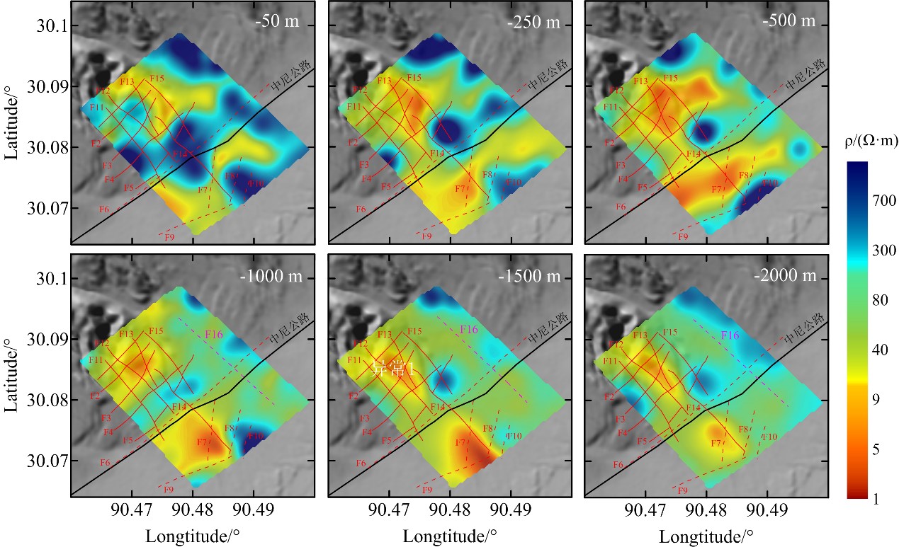 本次工作在羊八井地热电站停产改造期间,利用项目团队自主研发的SOTEM探测系统获得了6条线剖面共366个测点的SOTEM数据;利用研究所底青云团队自主研发的地面电磁探测(SEP)系统,获得了4条剖面共54个测点的MT数据(图1)。然后分别利用SOTEMsoft和ModEM软件对SOTEM数据和MT数据进行反演处理,得到了地热田不同深度范围内的三维电性结构(图2和图3)。