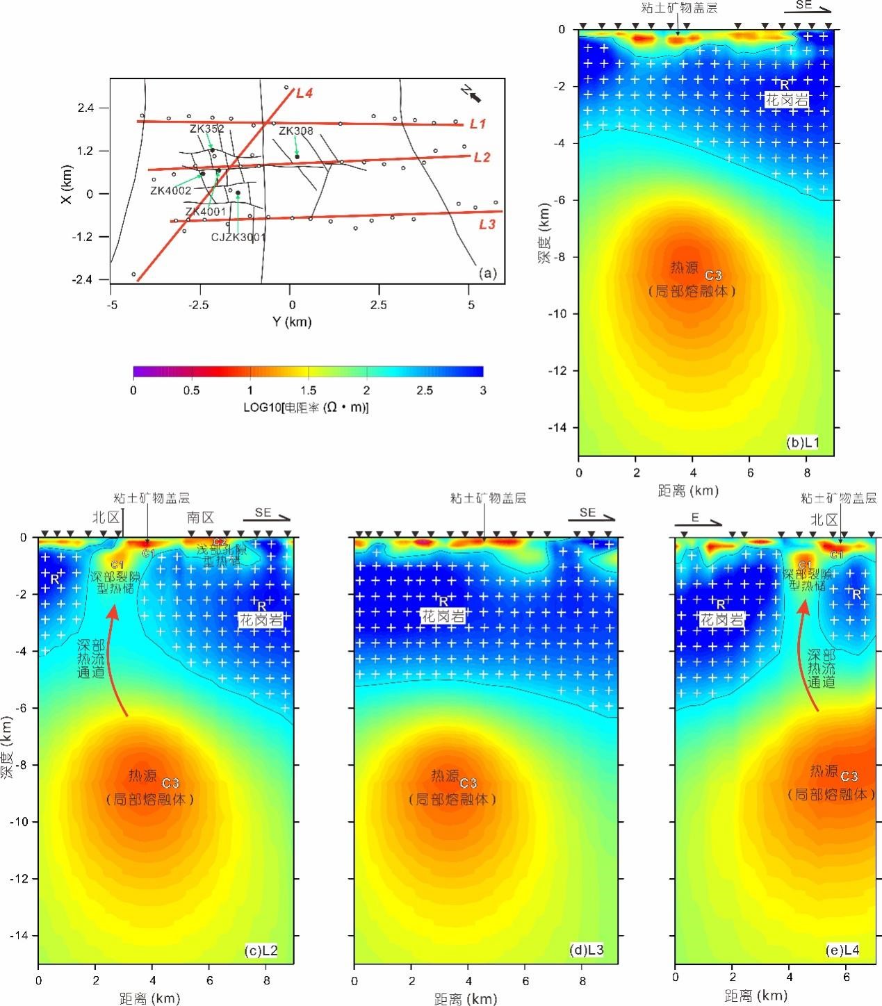 羊八井地热田至今没有发现第四纪火山岩,热源性质、深部热储特征、地热流体升流通道等问题曾经争论了许多年。Hochstein和Yang(1995)提出了羊八井深循环地热水成因模式。但随着ZK4002、ZK4001井先后成功揭露出超过250℃的地热流体,国内外同行对该地热田具有岩浆热源的属性已达成共识。氦同位素测定表明,地热气体中来自地幔的组分约为3%。据此可以推断局部熔融体主要是地壳物质组分,通过深大断裂混入了少量的来自青藏高原地幔楔的流体组分,与同属亚东-古露裂谷的羊易、古露等高温地热田类似。国际合作项目(INDEPTH)研究发现, 在羊八井等地15~20km深度存在着含水的花岗质岩浆层,而这次在地热田中部6.2~14km深度范围内探测到的局部熔融体很可能是来自该岩浆层的上涌,局部熔融体的平均深度是10.1km。