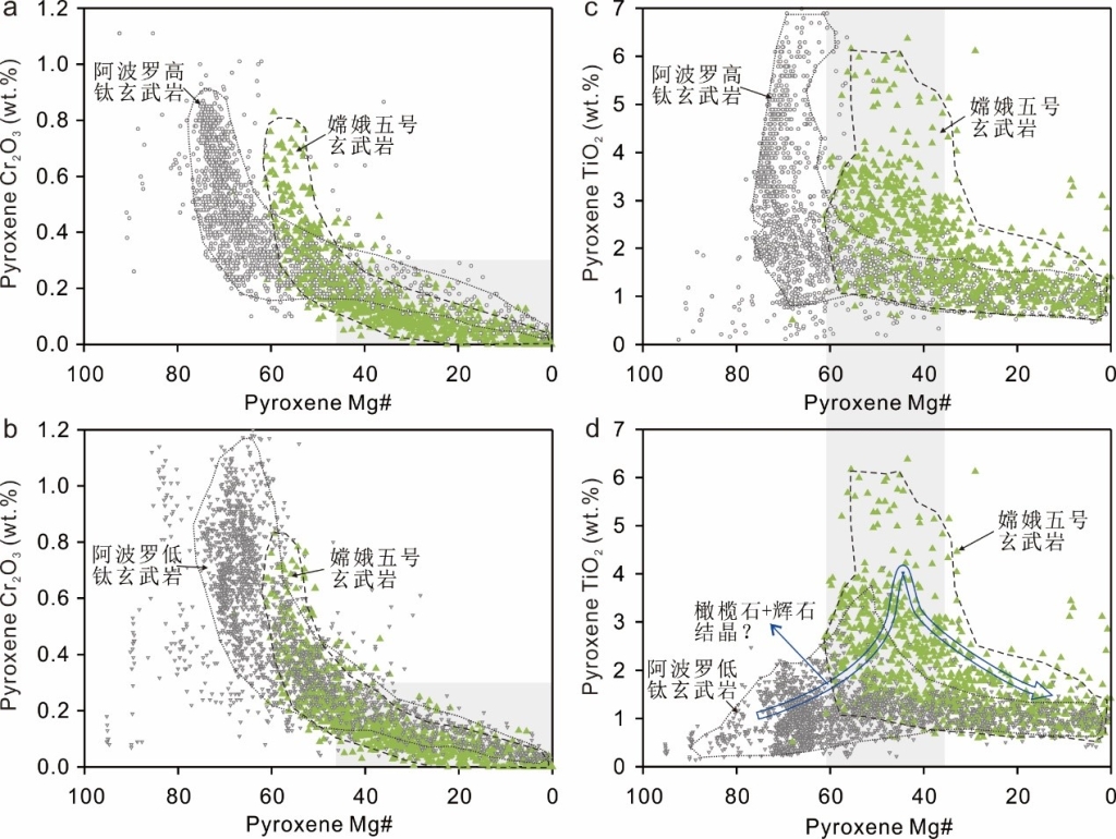 综上所述,研究表明嫦娥五号辉石仍反映了低钛熔体演化过程,最终使辉石具有高Ti和低Cr含量,进而形成高的Ti#值。