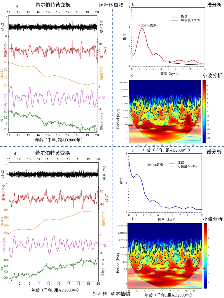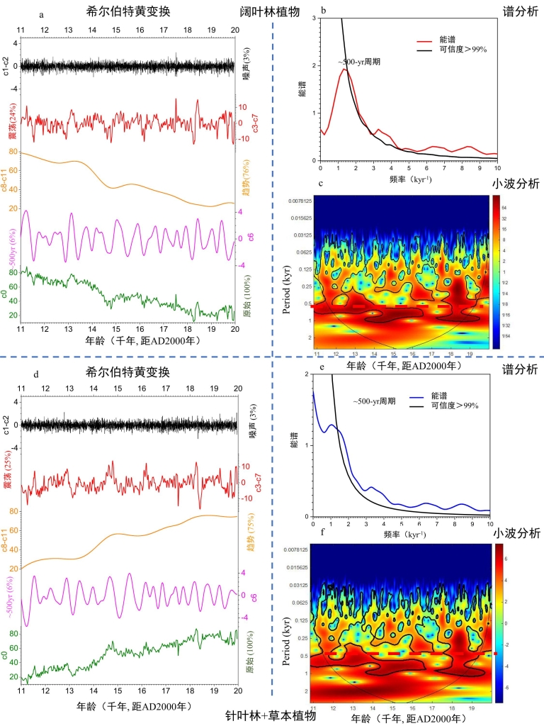 图1 阔叶树和针叶树+草本植物百分比的时间序列分析结果。(a、d)希尔伯特黄变换结果:c0分量代表原始的阔叶树、针叶树+草本植物百分比。为了去除高频波动(c1+c2)和轨道趋势和千年尺度突变事件(c8–c11),作者对原始c0分量进行分解,并把c3–c7分量相加,生成了一个新的去趋势时间序列(c3–c7)。作者使用多元线性回归模型计算了分量的解释方差。(b、e)阔叶树、针叶树+草本植物百分比谱分析结果。(c、f)阔叶树、针叶树+草本植物百分比小波分析结果