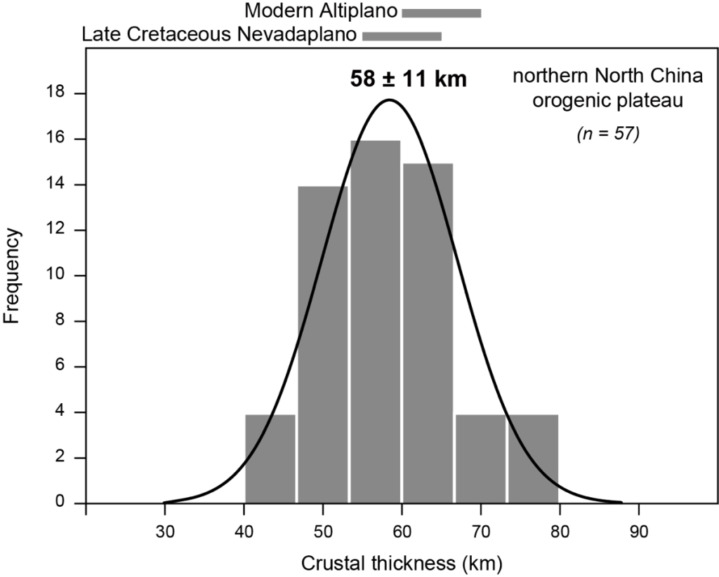 图2 华北北缘二叠纪造山带地壳厚度,显示与晚白垩世内华达高原及现今安第斯造山带Altiplano高原的地壳厚度相当