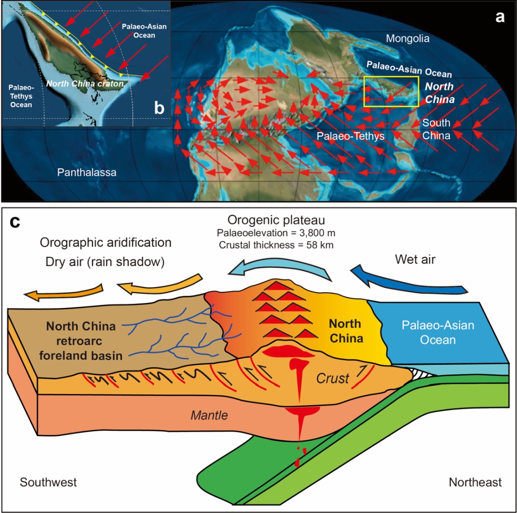 潘吉亚超大陆(Pangea)是距离人类最近的超大陆,存在于晚石炭世至三叠纪期间,由北侧劳亚大陆与南侧冈瓦纳大陆拼合形成。在此期间,地球环境经历了剧烈变化,表现为由冰室向温室地球转变,并发生了广泛的大陆干旱化。潘吉亚超大陆拼合期间大陆演化与晚古生代气候变化之间的相互关系,包括全球变冷和干旱化,仍然是一个未解之谜。以往研究多集中于欧洲海西造山带,认为大陆碰撞造山带对二叠纪的气候环境具有重要影响。华北北缘晚石炭世—二叠纪地层记录了古亚洲洋增生造山过程和由湿润向干旱环境的变化过程,提供了研究潘吉亚超大陆聚合与古气候环境变化关系的新窗口。