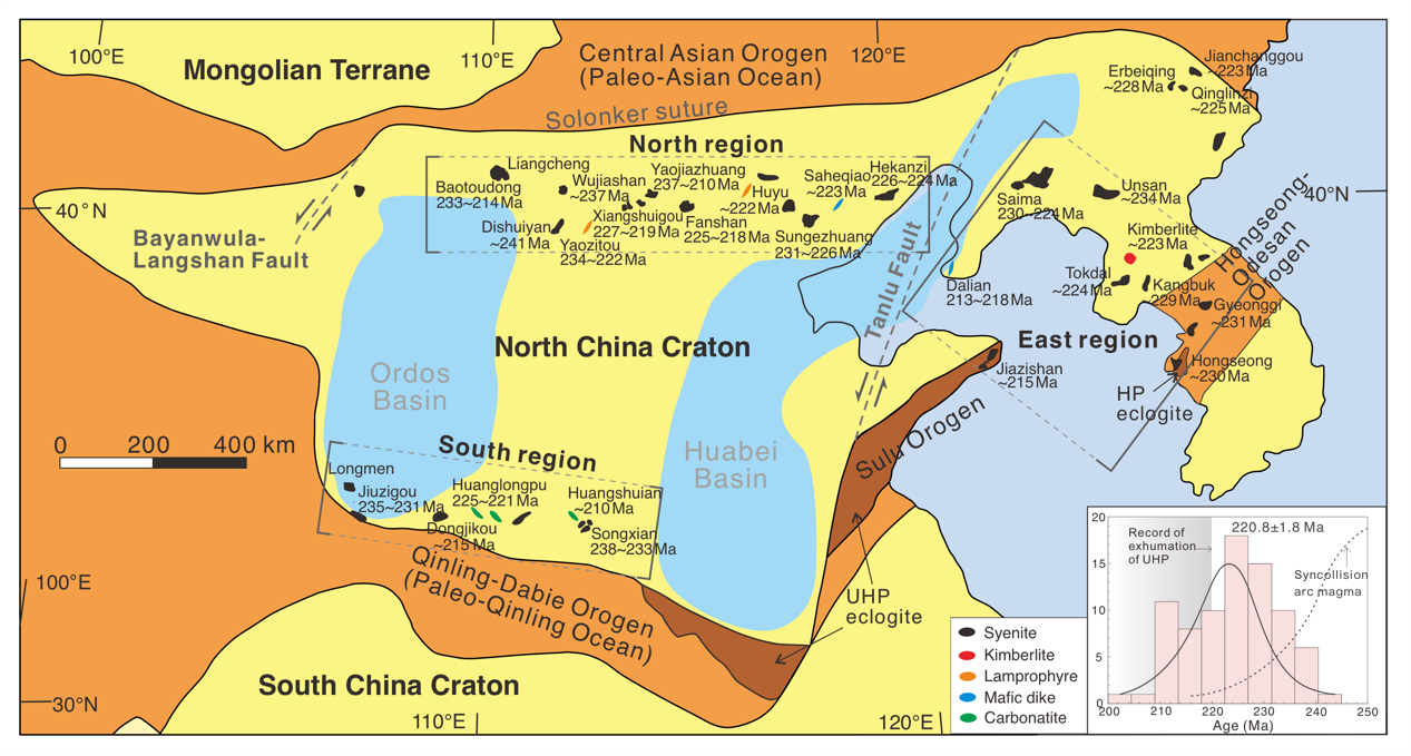 大陆岩石圈地幔是维持克拉通稳定的关键,它通过大陆地壳生长过程中长期的熔体抽离而变得难熔和亏损因而稳定。但受到俯冲板块产生熔体的交代作用,岩石圈地幔会再富集,不同类型熔体的交代作用使得岩石圈地幔不均一。华北克拉通在中生代发生了克拉通破坏,研究其破坏前岩石圈地幔不均一演化殊为重要。其中,在晚古生代至早中生代期间,华北克拉通北缘、南缘和东南缘分别受到古亚洲洋、古秦岭洋和华南板块的俯冲作用,并且在晚三叠世到达造山后伸展阶段,形成了以碱性正长岩、霞石正长岩为代表的罕见的环克拉通幔源碱性岩带(图1)。大规模碱性岩浆活动为揭示晚中生代克拉通破坏前岩石圈地幔性质提供了难得的研究对象。