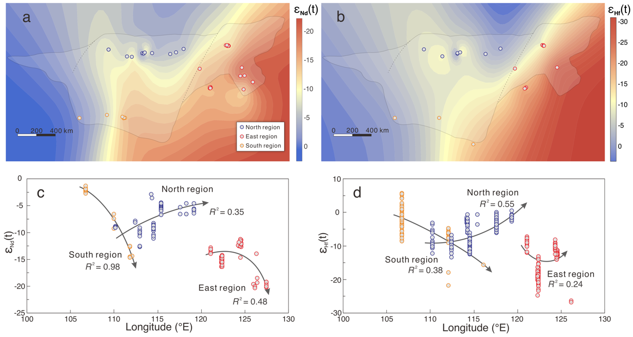 图2 碱性岩全岩Nd同位素和锆石原位Hf同位素的空间分布等值图。该图揭示的地幔源区不均一性与差异性俯冲交代空间上耦合