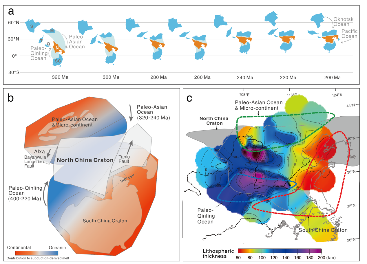 除了交代物质差异引起的岩石圈地幔不均一性之外,在华北克拉通北缘和南缘还存在东西向的同位素变化趋势,可能指示了古亚洲洋和古秦岭洋顺时针剪刀式闭合的过程,最早闭合的位置有更多陆壳物质交代形成较富集的岩石圈地幔(图3)。正如前人所揭示,这种剪刀式闭合过程可能为华北克拉通郯庐断裂的左行走滑提供动力。再循环陆壳交代作用的影响为后来的中生代岩石圈破坏也提供了先决条件。研究不仅深化了我们对岩石圈地幔演化的认识,还为理解构造演化过程提供了重要思路。