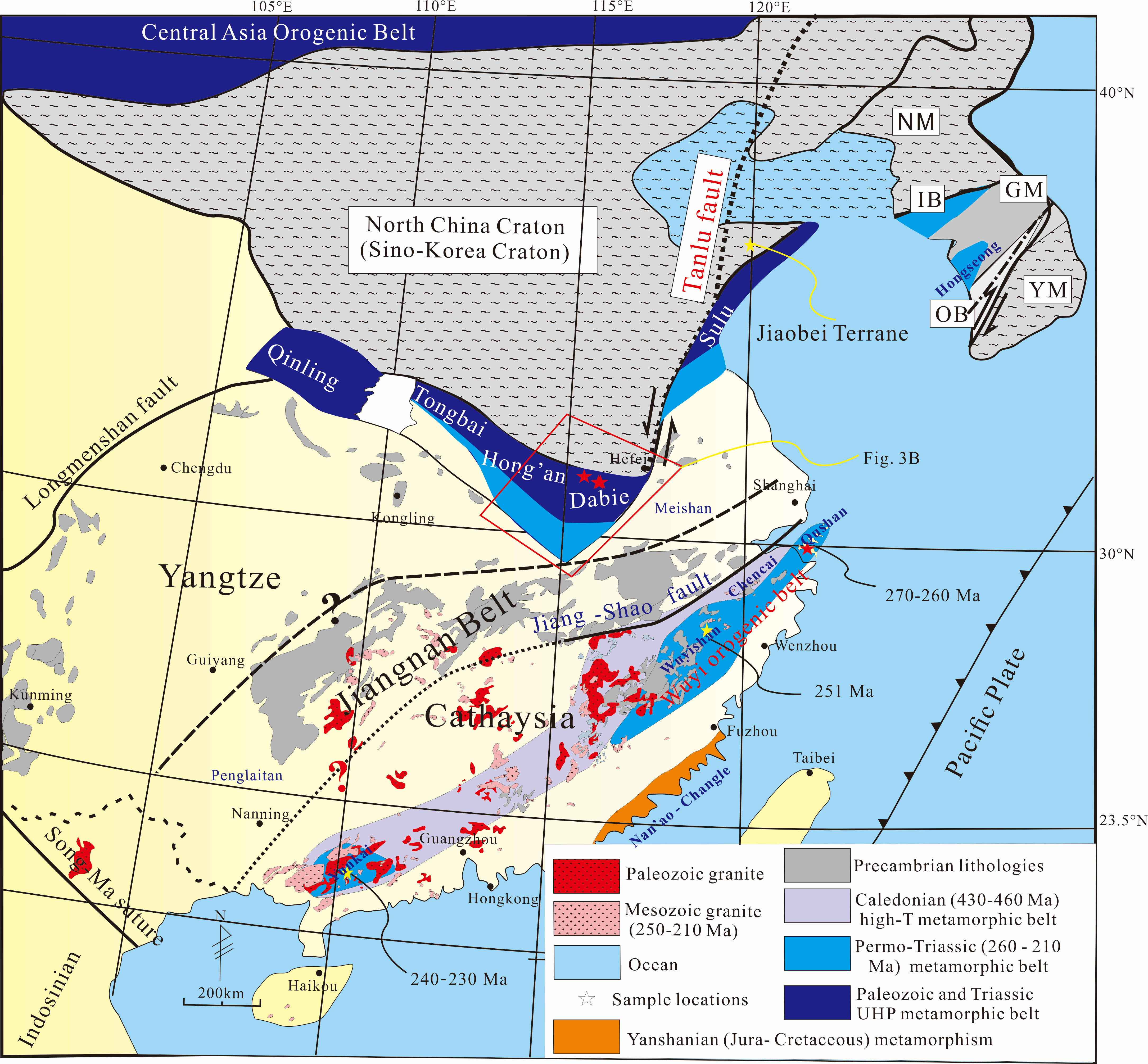 图1 华南、华北和朝鲜半岛构造单元划分以及区域地质简图