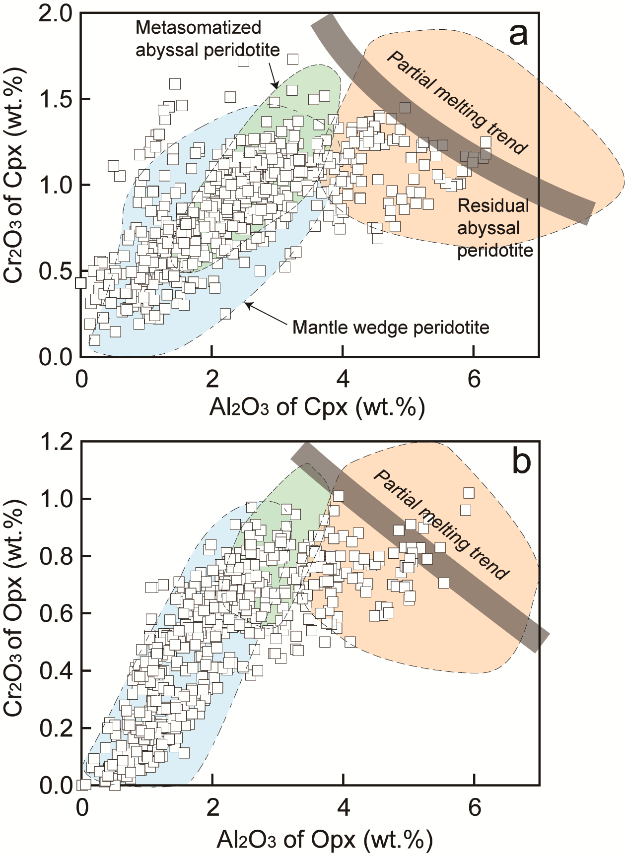 图2 蛇绿岩地幔橄榄岩中单斜辉石和斜方辉石的Cr2O3-Al2O3相关图解