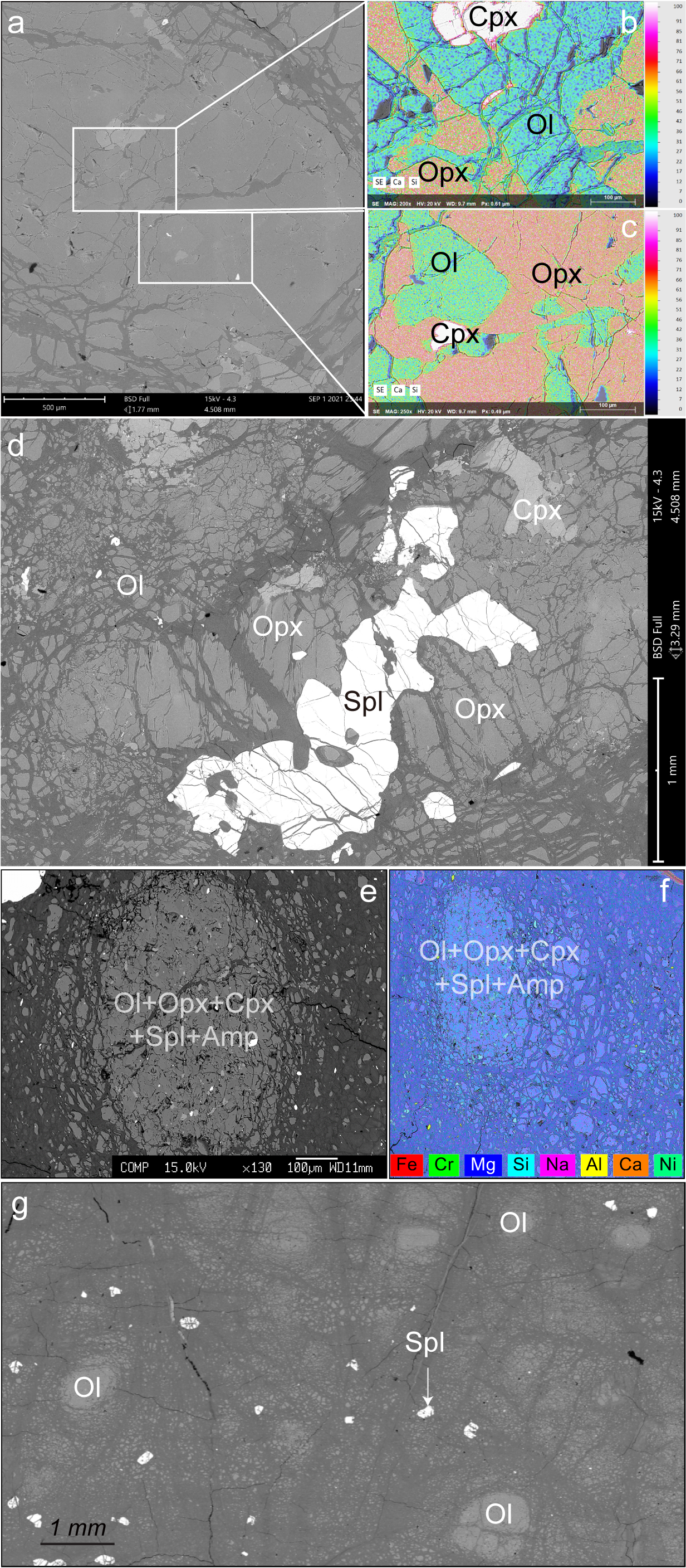 图1 蛇绿岩中铬铁矿石(a和b)和橄榄岩(c-i)中的尖晶石形态特征
