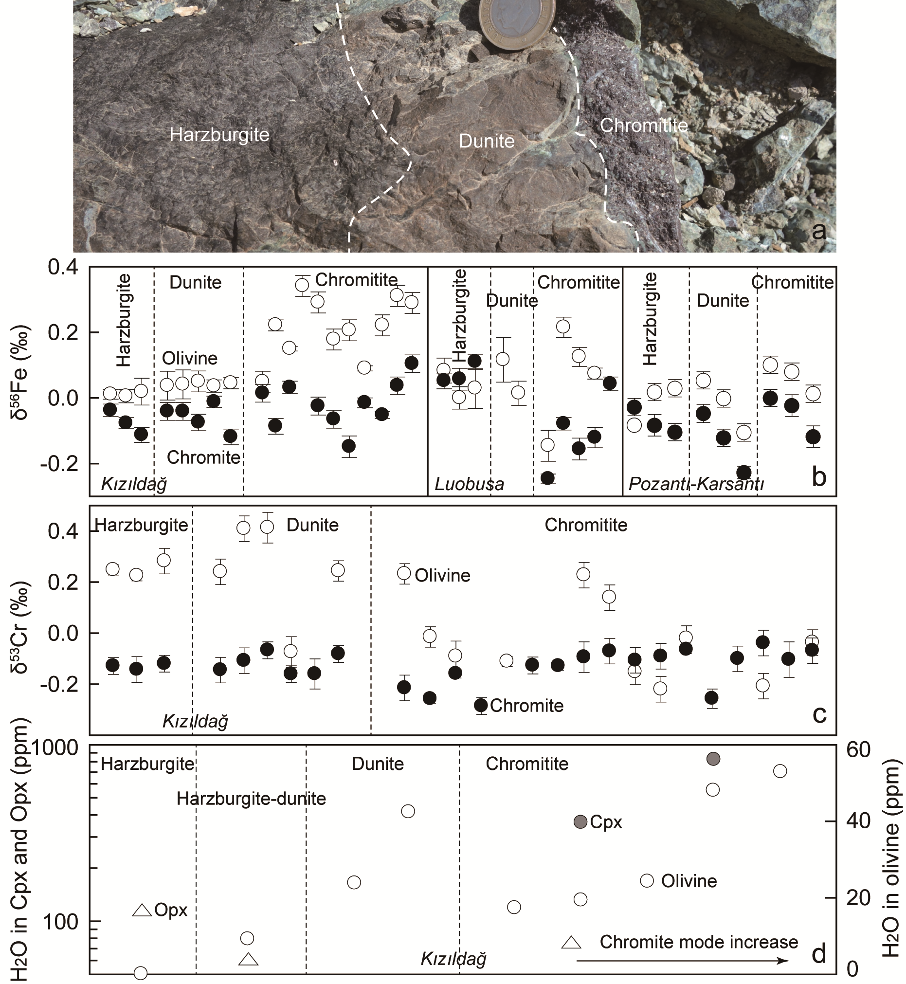 图4 蛇绿岩地幔橄榄岩和铬铁矿石中矿物的Fe和Cr同位素及水含量组成