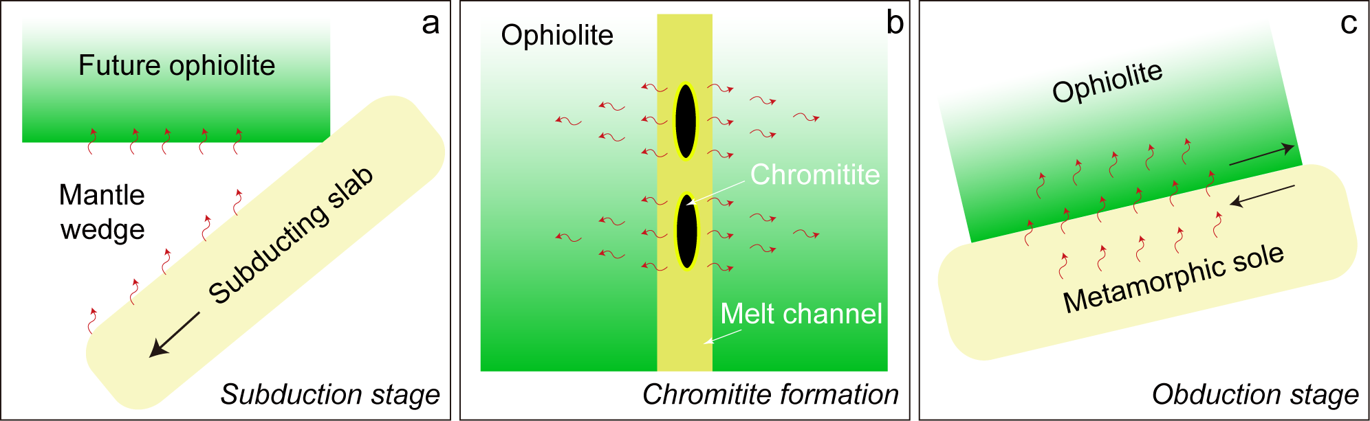 上述特征表明蛇绿岩中地幔橄榄岩的所有矿物均经历了形态和成分改造,已很少保留大洋岩石圈地幔部分熔融的信息。改造地幔橄榄岩的相关过程可能与俯冲阶段板片脱水或熔融、铬铁矿床形成引起熔流体渗透、仰冲过程中变质底板脱水或熔融等有关(图5)。