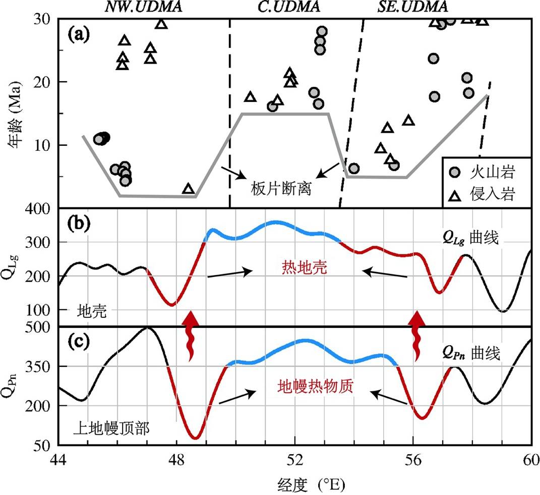 图3 UDMA岩浆岩年龄分布及沿走向Q值变化。(a)UDMA岩浆岩年龄分布(修改自Chiu et al., 2013)。实线勾勒出年轻岩浆活动沿走向的年龄变化。(b-c)沿UDMA走向的
