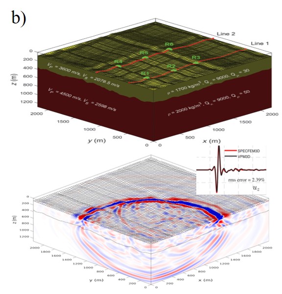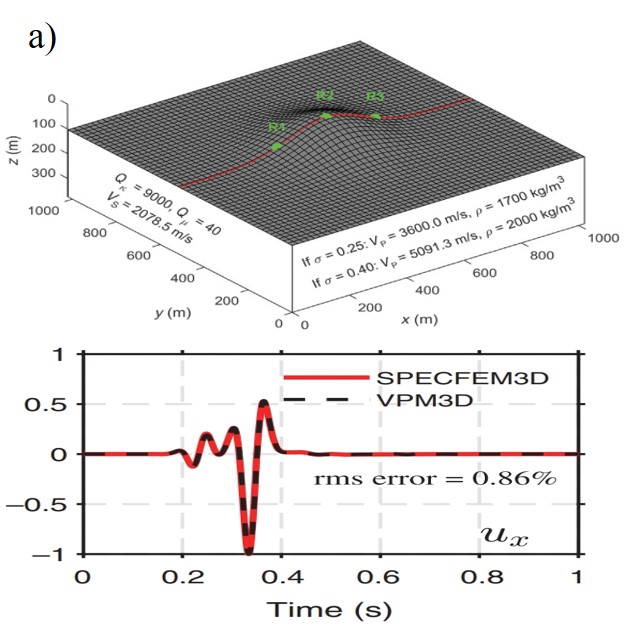基于以上背景,800彩票油气资源研究院重点实验室博士生董树立、周旭晖与陈景波研究员提出了一种基于有限差分的粘弹性参数修正法(VPM)来实现三维粘弹性波方程中的自由表面边界条件。它与基于数学假设的粘弹性应力镜像法(VSI)不同,其推导过程借鉴了平均介质理论、真空近似和数学极限的思想,相对后者具有更加合理的物理解释。该方法以阶梯离散策略拟合起伏地表,实施简单,三维情况下仅需要5种网格单元足以表示任意起伏地形(图1)。数值模拟结果显示,无论是在简单起伏地形还是复杂不规则起伏地形,VPM与参考解(SPECFEM3D)都有较好的吻合度(图2)。