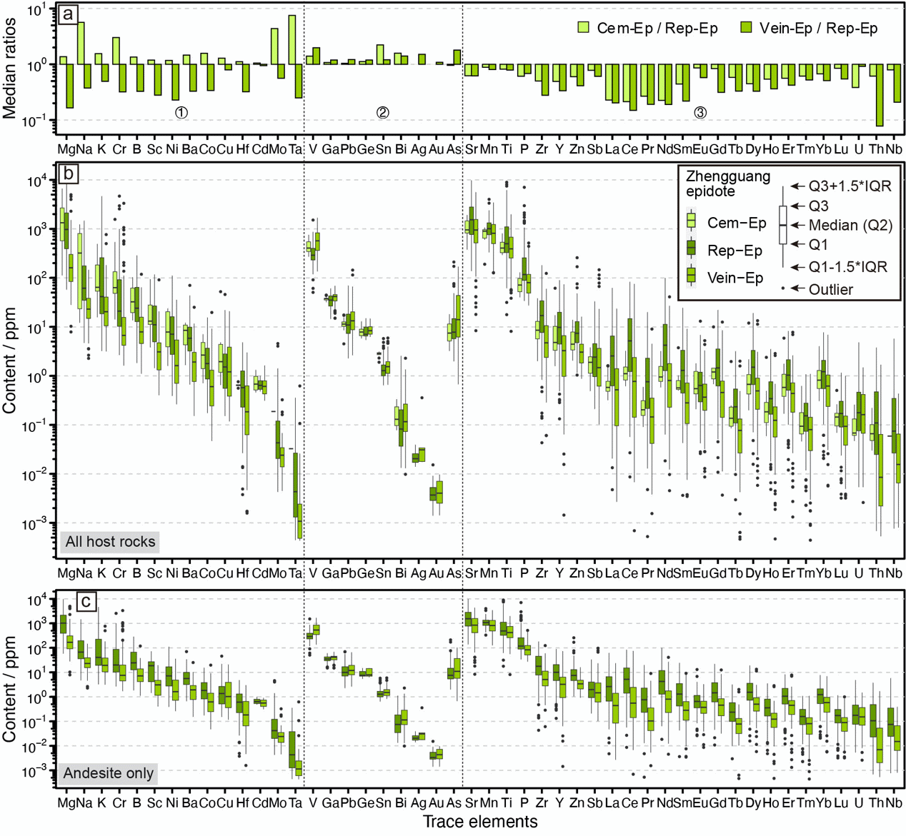 图3 争光绿帘石微量元素柱状图和箱线图。(a) 经交代绿帘石的元素含量中位数标准化的胶结物绿帘石和脉状绿帘石的元素含量中位数。所有岩性 (b) 和仅安山岩 (c) 的争光绿帘石微量元素含量箱线图