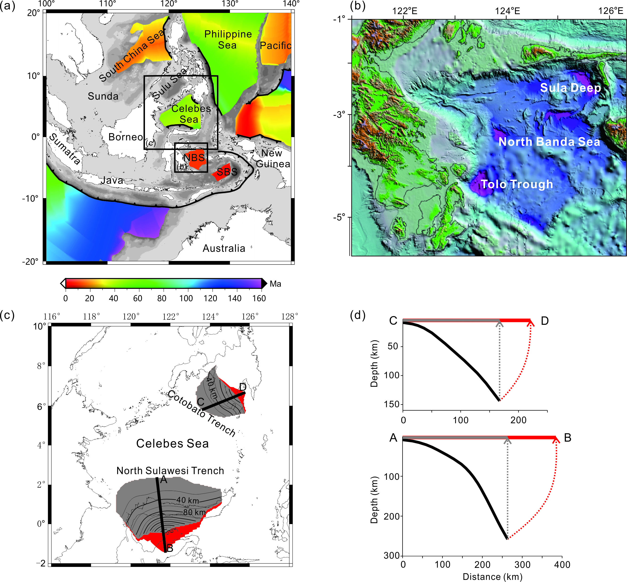 图1 (a)东南亚的洋盆和俯冲带。NBS表示北班达海,SBS表示南班达海;(b)北班达海及其周边地区测深图;(c)北苏拉威西和哥达巴托海沟中的西里伯斯海板块俯冲图(灰色不规则多边形表示直接投影到表面上的俯冲板块的形状,红色不规则多边形是重建的俯冲板块在表面的范围);(d)俯冲板表面重建示意图。黑线代表俯冲的板块。计算出的长度投影到平面上显示为红线