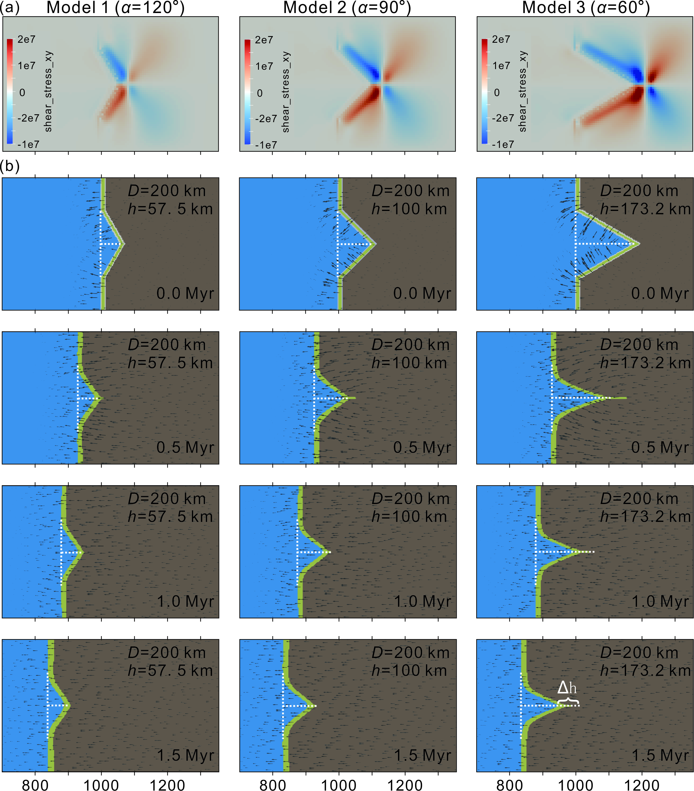 图3 (a)模型1、2、3初始阶段上表面(y=0 km)的剪应力;(b)角几何形状的演化。虚线表示初始阶段D和h的长度。∆h表示h长度的减小。黑色箭头表示速度