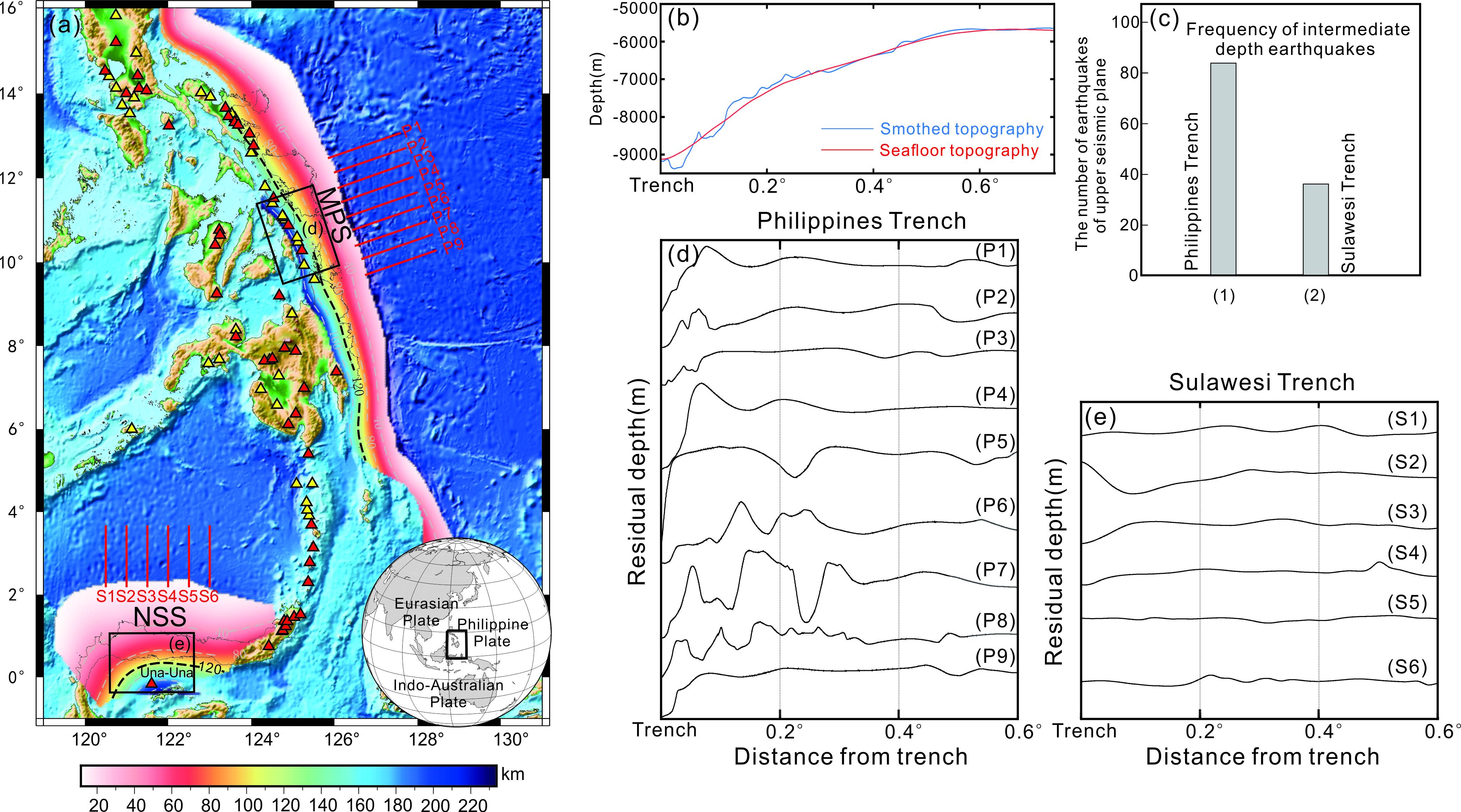 图1 (a)北苏拉威西俯冲带(NSS)和菲律宾中部俯冲带(MPS)的位置,其中Una-Una火山已经被证实非俯冲带岛弧火山;(b)海底地形和平滑地形;(c)中等深度地震(70-100 km)的频率,其中黑框表示地震计数的位置(两个俯冲带的等效区域);(d)减去平滑地形后的MPS海沟外隆区地形;(e)减去平滑地形后的NSS海沟外隆区地形