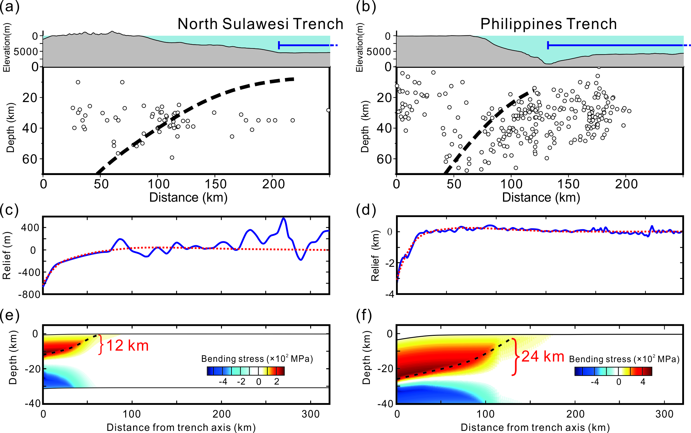 图2 NSS和MPS的挠曲应力分布的对比。(a、b)NSS和MPS浅层俯冲板块;(c、d)NSS和MPS的模拟地形(红色虚线)与实际地形(蓝色线);(e、f)NSS和MPS的挠曲应力分布。黑色虚线表示屈服最大深度
