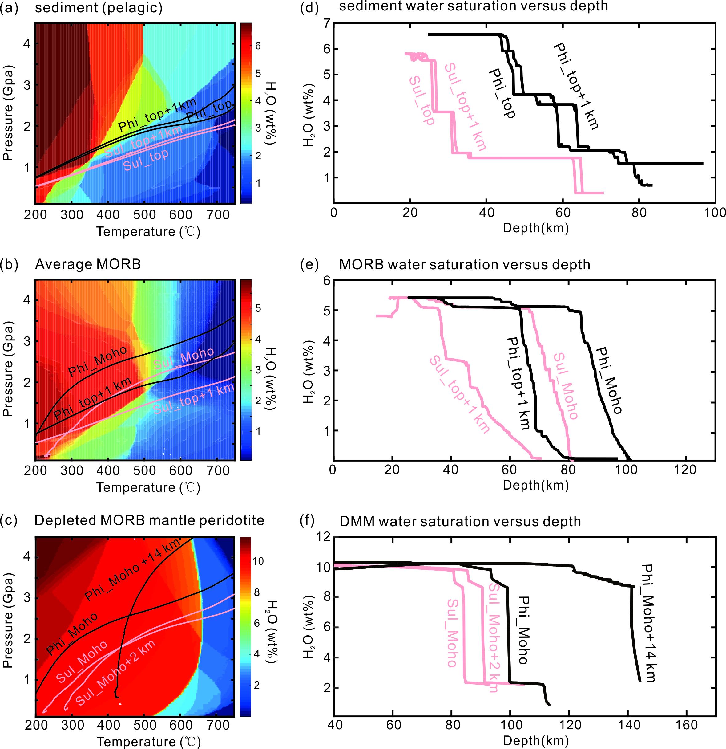 图3 深海沉积物(a)、平均洋脊玄武岩(MORB)(b)和亏损MORB地幔橄榄岩(DMM)(c)矿物含水相图与计算的P-T曲线结合;(d)沉积物脱水过程;(e)洋壳脱水过程;(f)含水地幔脱水过程