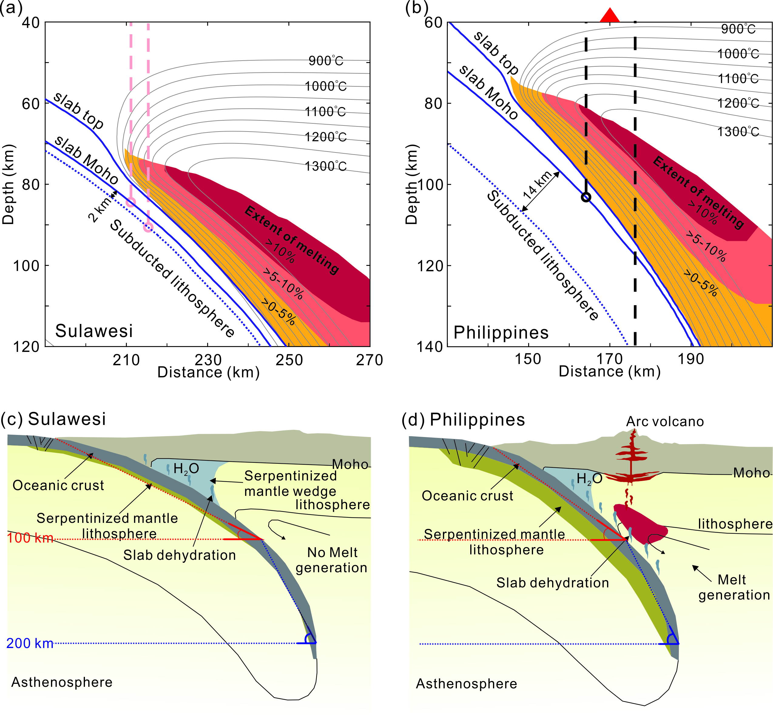 地球上大多数俯冲带都存在与其海沟平行的火山岛弧,但仍有一些俯冲带或俯冲带的部分区域缺少相应的火山弧,年轻的北苏拉威西俯冲带(NSS)就是其中之一。目前的研究表明俯冲带岛弧缺失的主要原因有:俯冲板片的含水效能低,存在特殊的俯冲构造(如平板俯冲、洋脊俯冲等),俯冲板片未超过弧下深度,俯冲板片角度的突然变化,上覆板片处于挤压构造环境等等。然而上述原因都不能解释NSS岛弧的缺失。是什么原因导致了NSS的岛弧缺失?为什么俯冲深度、起始时间和机制都相近的菲律宾俯冲带中段(MPS)存在岛弧火山呢(图1a)?为此,800彩票海陆油气综合地球物理团队董淼副研究员、郝天珧研究员等分别从输入板块水化程度、俯冲板块脱水和地幔楔热结构三个方面开展了对比研究。