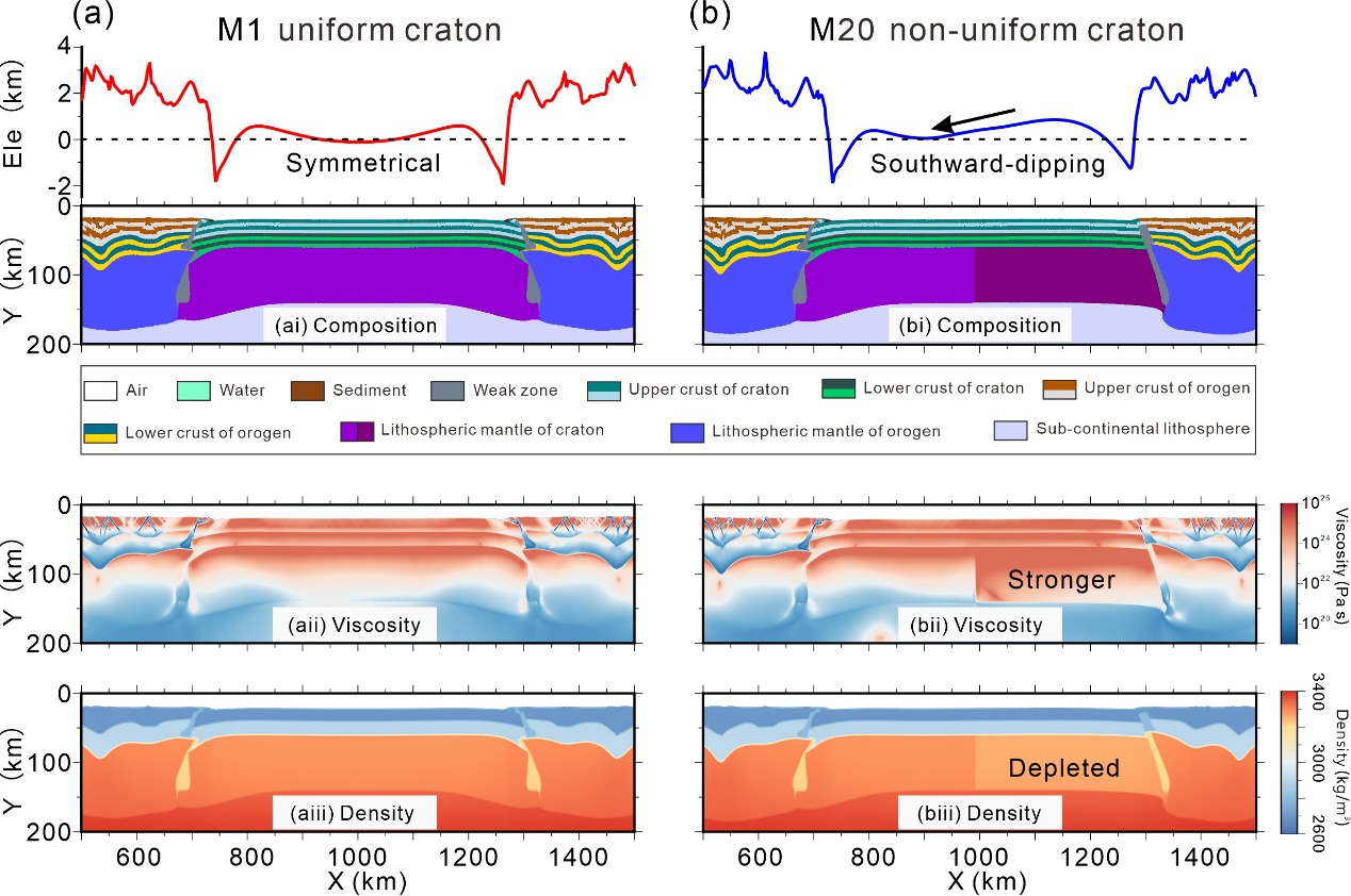 聚焦于上述科学问题,800彩票岩石圈演化国家重点实验室博士研究生向宵与导师陈林研究员、李忠研究员、颜智勇博士后,联合浙江大学陈汉林教授和林秀斌教授、中国自然资源航空物探遥感中心徐曦高级工程师,在深入分析塔里木盆地及其周缘相关观测资料的基础上,利用二维热-力学数值模拟方法,研究了挤压背景下克拉通岩石圈地幔强度和亏损密度的横向变化如何影响克拉通盆地的基底形态。模拟结果显示(图2):