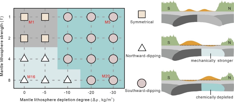 图3 克拉通岩石圈地幔强度和亏损密度变化对克拉通盆地基底形态影响的模式图。正方形代表对称的克拉通盆地基底,三角形和圆形分别代表“北倾”和“南倾”的克拉通盆底基底,且南克拉通在造山带下有更陡的俯冲