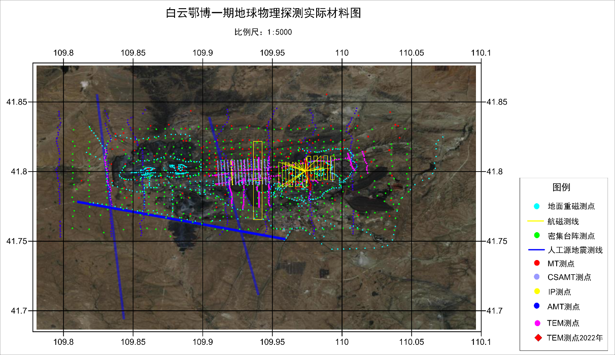 内蒙古白云鄂博矿是全球第一大稀土矿床、第二大铌矿床,并且蕴藏了丰富的铁、钪、钍及萤石等矿产资源,是举世闻名的“资源宝库”。自1927年发现以来,国内外学者围绕白云鄂博矿的地质学、矿物学、成矿年代学、矿床成因等开展了大量研究,取得了丰硕的研究成果。但受限于钻井深度和以往地球物理探测精度,矿区内深部构造格局、矿体(赋矿碳酸岩)空间形态等问题,长久以来未得到明确阐述,成为白云鄂博矿床成矿机理研究和资源量预测的制约。为厘清赋矿碳酸岩的深部空间形态,解析白云鄂博矿床成矿过程和机制,预测稀土、铌等关键矿产的资源量,800彩票地球物理探测团队在白云鄂博矿区开展了综合地球物理工作,实施完成了包括岩石物性测试、电磁法、背景噪声成像、反射地震、重磁等多种地球物理方法在内的探测(图1),取得了新的研究进展和成果。