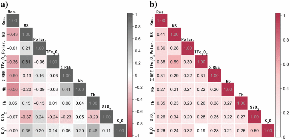 图2 铁矿石物理性质(电阻率Res、磁化率MS和极化率Polar)与矿物成分之间的相关性。(a) 基于 Pearson 的相关性和 (b) 基于 MIC 的相关性