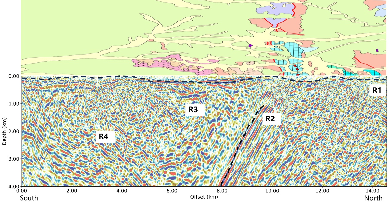 图3 二维主动源地震勘探叠前深度偏移结果与相应的地质图, R1-R4为识别的主要地下地质构造