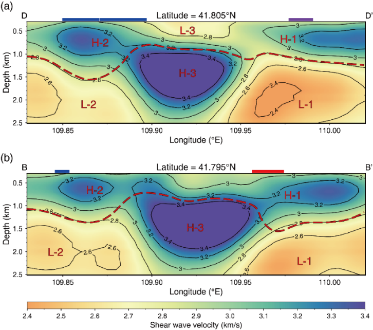 朱邓达博士与导师王建研究员等人,基于在白云鄂博矿区布设的496个短周期密集台阵,利用背景噪声成像方法,首次揭示了整个矿区2.5 km以浅的剪切波速度结构,推测了赋矿白云岩可能的三维分布形态及范围,为矿区的深部资源探测提供新的地震依据。