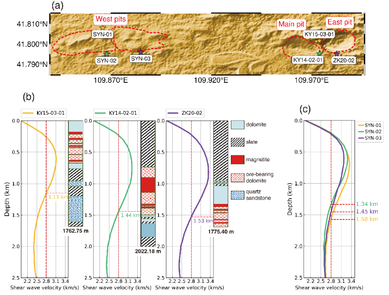 图5 (a)主、东矿区附近三个深钻(KY15-03-01,KY14-02-01和ZK20-02)以及西矿区附近三个点位(SYN-01,SYN-02,SYN-03)的地理位置;(b)主、东矿区附近三个深钻下方的S波速度与钻孔岩芯结果对比;(c)西矿区附近三个点位下方的S波速度结果