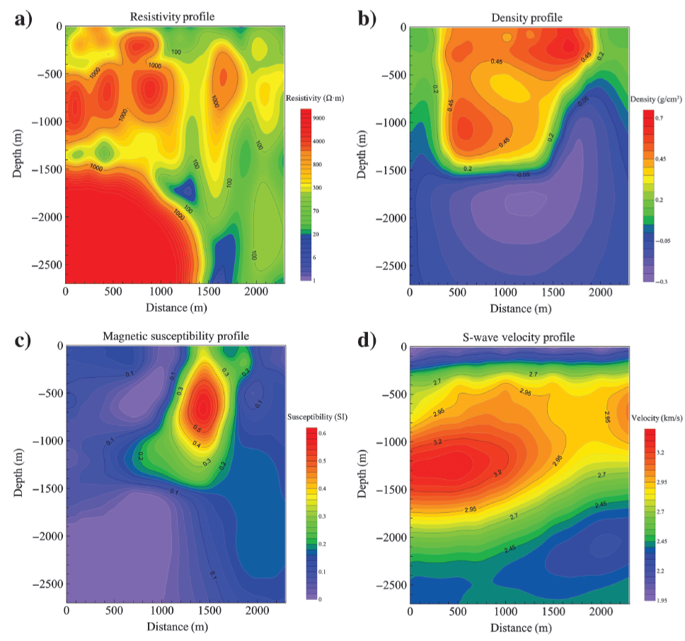 图6 主东矿之间四种物性反演剖面。(a)基于电性源瞬变电磁法数据反演的电阻率剖面;(b)基于地面重力数据反演的密度剖面;(c)基于航磁数据反演的磁化率剖面;(d)基于背景噪声成像的S波速剖面