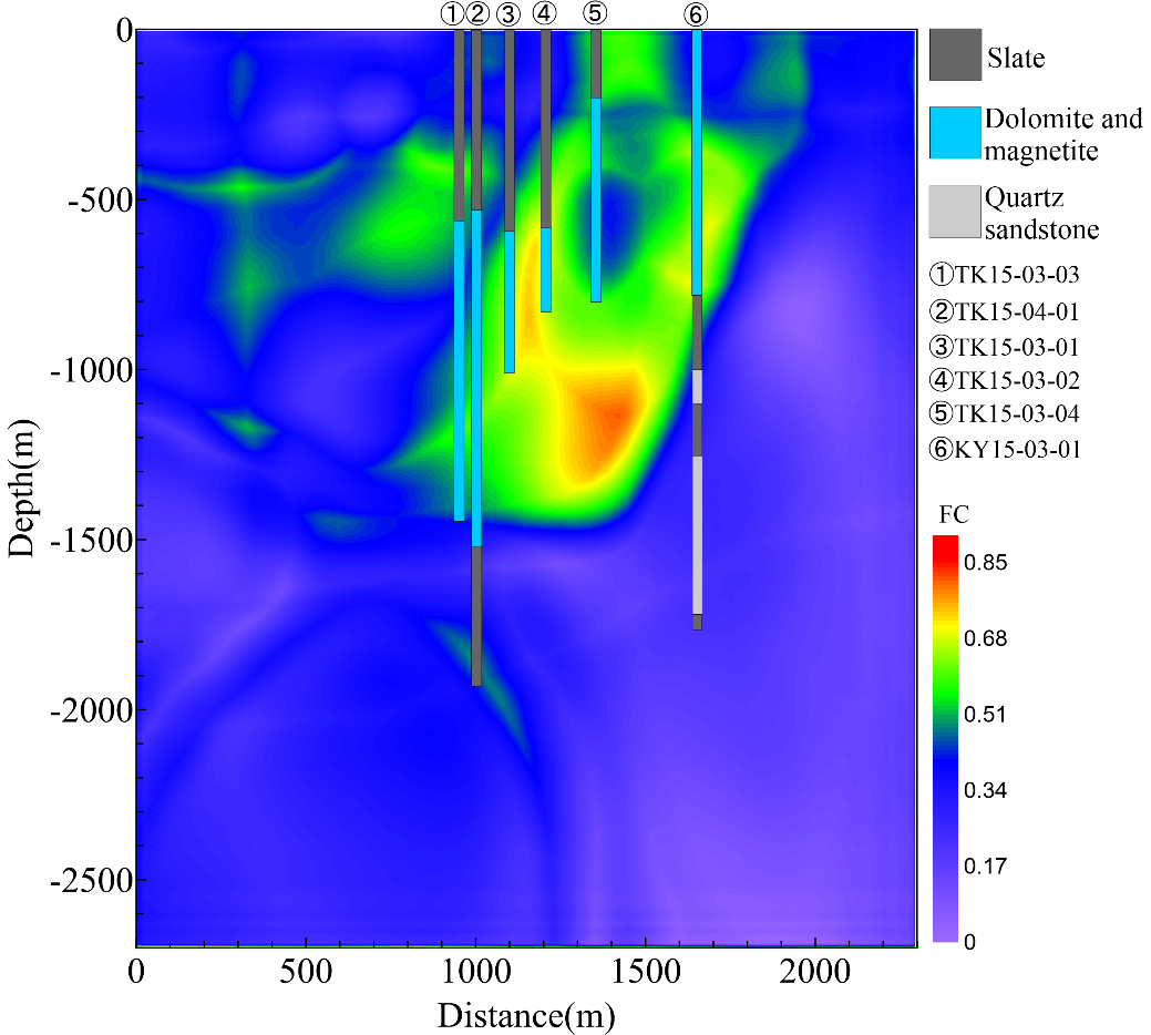 图7白云鄂博主东矿结合部位多源地球物理数据融合结果与钻孔验证情况