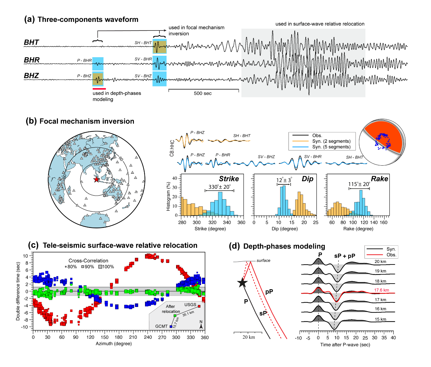 图1 基于全球远场地震波波形模拟和分析约束地震震源参数的系列方法。(a) 示例波形用于展示该研究中使用的三分量地震波;(b)基于远场三分量P波和S波约束地震震源机制解的波形反演方法;(c)远震面波相对定位方法,用以精确确定地震的水平位置;(d)深度震相模拟方法,用于精确约束地震的深度