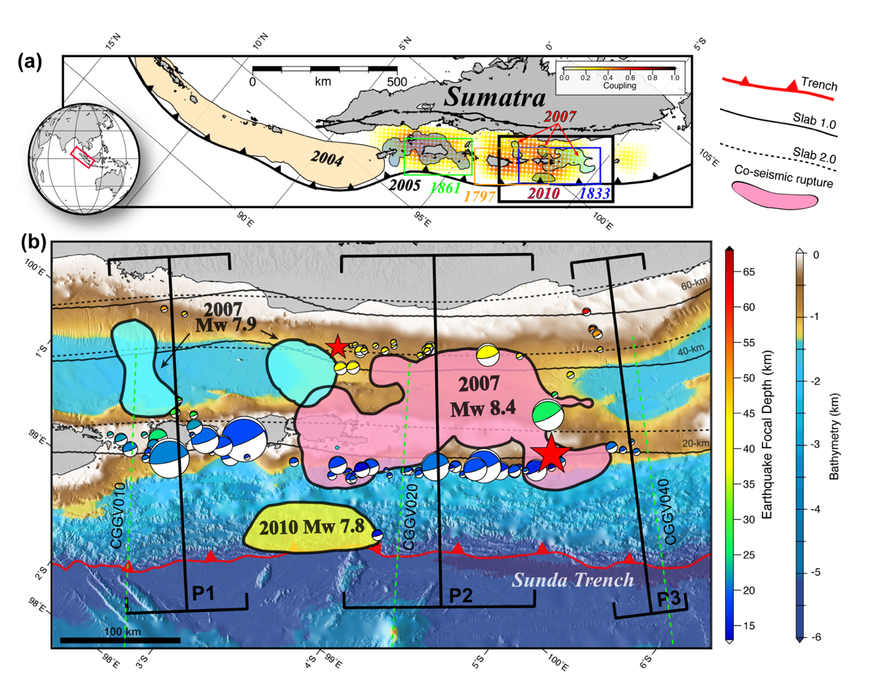 图2 研究区域及该研究获得的地震震源参数。(a)苏门答腊俯冲带历史大地震及前人研究获得的震间闭锁模型;(b)苏门答腊Mentawai地区概况,包括大地震同震破裂范围(2007年发生的Mw8.4 Bengkulu地震及其Mw7.9的余震,以及2010年发生的Mw7.8 Mentawai海啸型地震)及该研究中获得的中等震级地震的震源机制解