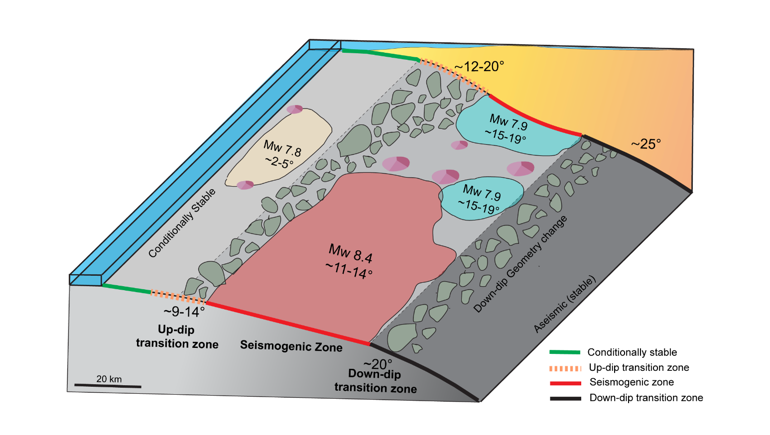 俯冲带大型逆冲断层(megathrust),即俯冲的大洋板片与上覆板片之间的边界,孕育了全球大多数8级以上的大地震。断层三维几何形态和摩擦等物理特性,控制着大地震破裂的起始、演化和终止,进而影响地震大小及其造成的地震和相关次生灾害(例如海啸)。因此,精细约束俯冲带大型逆冲断层的几何和摩擦状态,对理解大地震震源物理及防震减灾至关重要。