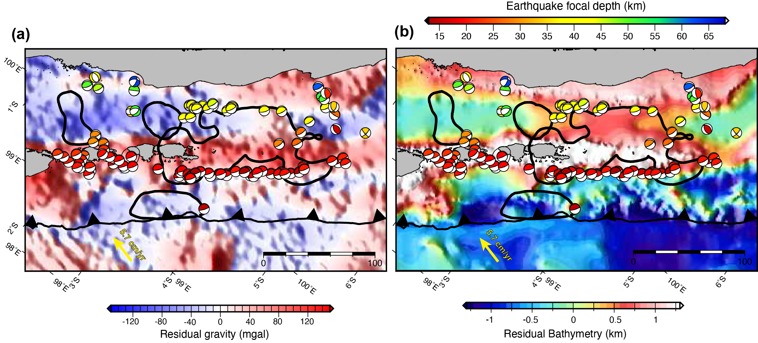 具体研究结果显示,这些中等震级的地震主要集中于2007年Mw 8.4 Bengkulu地震同震破裂区的上倾端(up-dip seismic belt)和下倾端(down-dip seismic belt),形成了两条明显的地震带(图2和图3)。下倾端地震带的倾角比主震倾角陡约8度,显示出大型逆冲断层几何在此处发生了明显的弯曲;这种断层几何形态的改变可能影响着大地震破裂向更深处传播,并伴随着由于温度变化导致的脆性到塑性的本构关系变化(图4)。上倾端地震带标志着孕震区与稳定滑动区(或条件稳定滑动区)之间的摩擦边界,并且具有显著的横向变化。这些横向和纵向的断层几何/摩擦变化极有可能对限制2007大地震的破裂范围起到了关键性作用(图4)。此外,地形和重力异常数据与上倾端地震带及2007主震同震变形分布高度一致(图5),指示了大地震同震破裂和地形/重力异常之间的因果关系,认为2007年Mw8.4地震破裂了一个永久性板块闭锁区域(凹凸体),而2010年的Mw7.8海啸型地震区没有造成显著地形/重力异常,对应更为不规则以及更长的发震周期,和断层上的条件稳定滑动摩擦本构关系密切相关。因此,在研究未来大型逆冲断层上的大地震时,考虑上倾端和下倾端地震带、地形异常及重力异常的影响至关重要。该研究完全使用远场地震波形数据,对随后的全球类似震源和断层几何研究具有指导性意义。