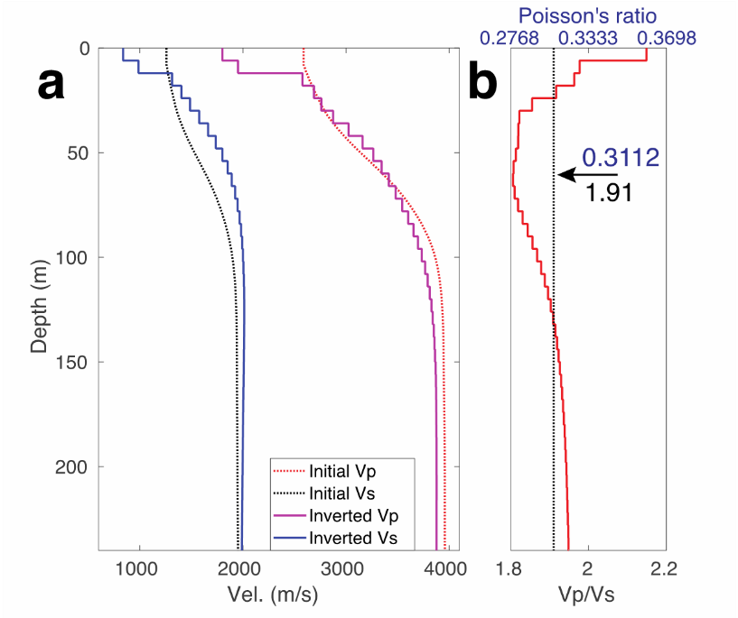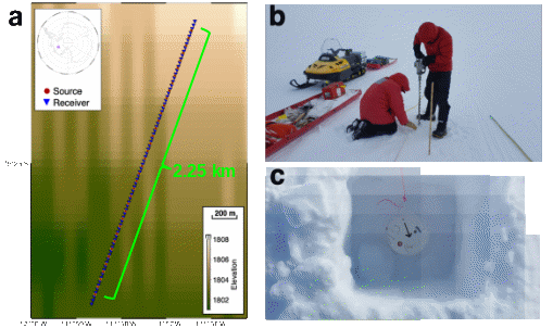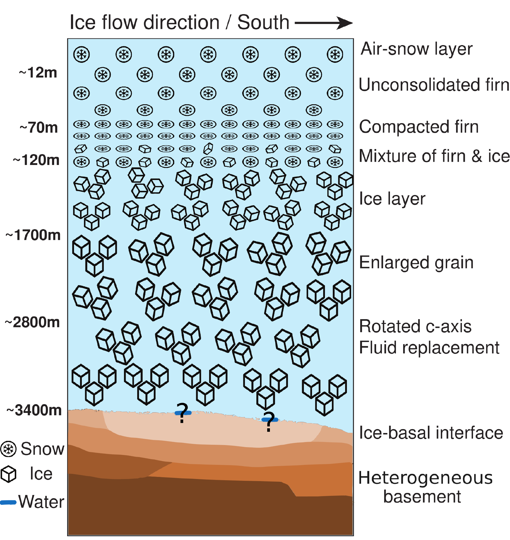 该项研究使用漏能、本征振型联合反演方法,增强了对冰盖浅层纵波速度反演的约束,通过分析纵横波速度比随深度变化,推测出冰盖浅层孔隙度变化情况。即随着深度的增加,由于重力作用浅层浮雪会逐渐压实并在70米深处达到孔隙闭合极限,之后随着深度的增加,孔隙度会有所上升并恢复至标准冰的水准。该压实深度与冰架的稳定性存在联系,可进一步用于估计冰架失稳的可能性。使用冰面接收的冰盖内部不连续界面反射纵、横波地震数据,研究团队对冰盖内部界面以及冰-岩界面进行了成像,成像结果表明冰-岩界面起伏较为剧烈、沉积层内具有非均质性。通过进一步分析纵、横波反射特征,推测出冰盖内部的流体替换可能会引起较强的PP反射和较弱的PS反射。由于流体的替换,不同冰层间的摩擦力会发生改变,进一步导致冰层间相对滑动速度的变化以及冰晶体对称轴的定向排列。该项研究结果为因冰晶体对称轴的定向排列变化导致的地震各向异性提供了一种成因解释,进一步增进了对冰盖动力学过程的认识。