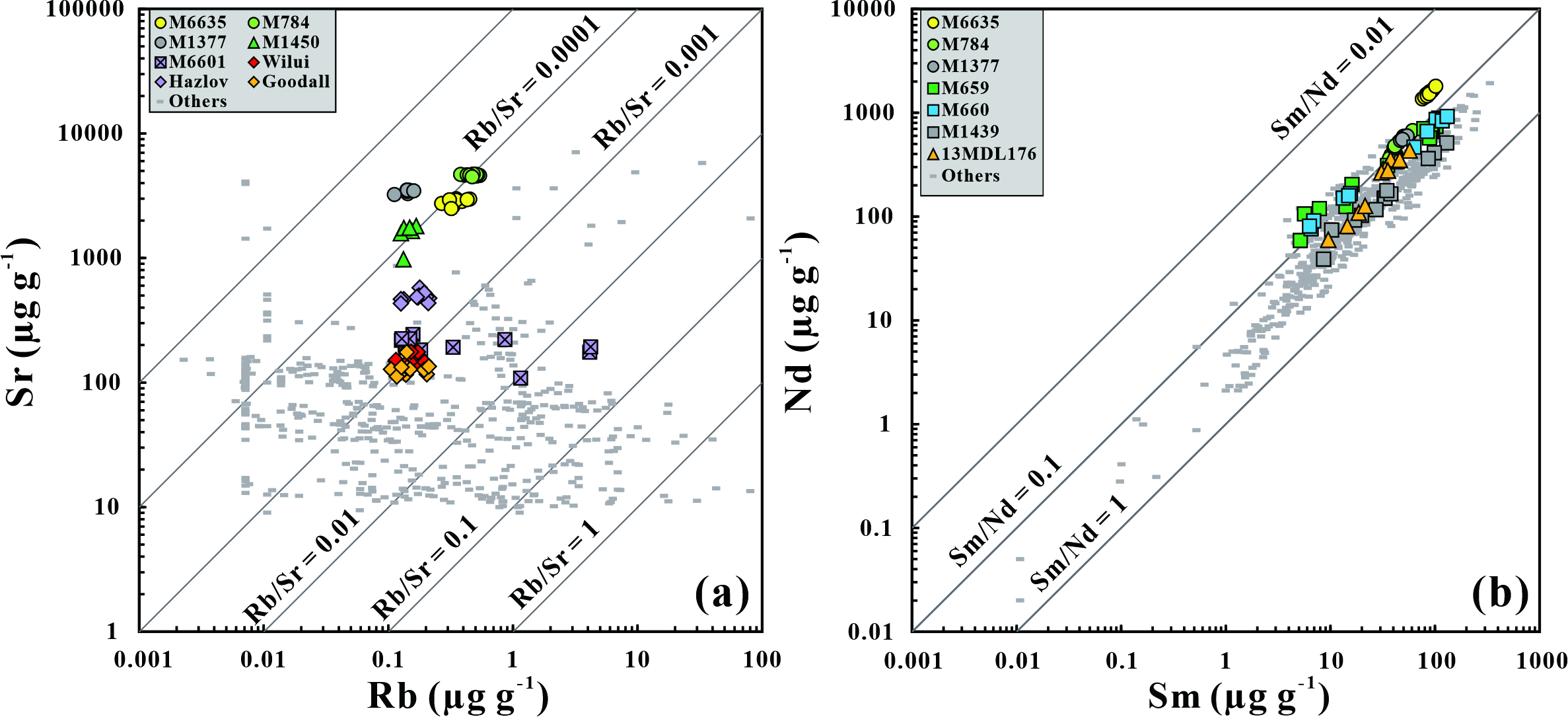 图1 (a) 符山石Rb-Sr含量关系与Rb/Sr比值;(b) 符山石Sm-Nd含量关系与Sm/Nd比值
